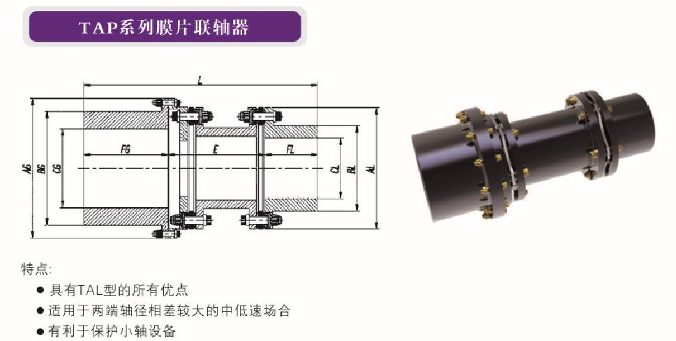 聯(lián)軸器型號 功率 / 轉速 (Kw/rpm) 公稱(chēng)扭矩 (KNm) 峰值扭矩 (KNm) *大許用轉速 (r/min) AG/AL (mm) BG/BL (mm) CG/CL max (mm) E(mm) FG/FL (mm) L(mm) TAP6115 0.072 0.68 2.4 15000 146/115 98/74 70/50 110 75 260 TAP6135 0.16 1......